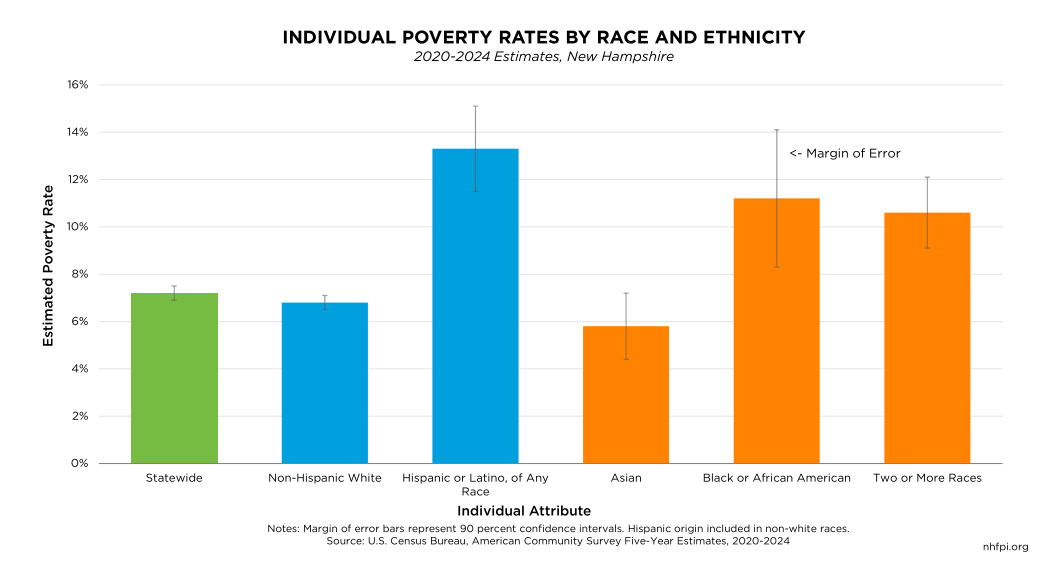 While poverty rates continue to remain elevated for some groups, there have also been some significant declines in poverty compared to the pre-COVID-19 pandemic period. Relative to data from 2015-2019, the poverty rate during the 2020-2024 period declined by about 3.1 percentage points among Hispanic or Latino Granite Staters and by 8.6 percentage points for Black or African American Granite Staters. Among families with children headed by a single woman, poverty rates also declined by about 3.4 percentage points.