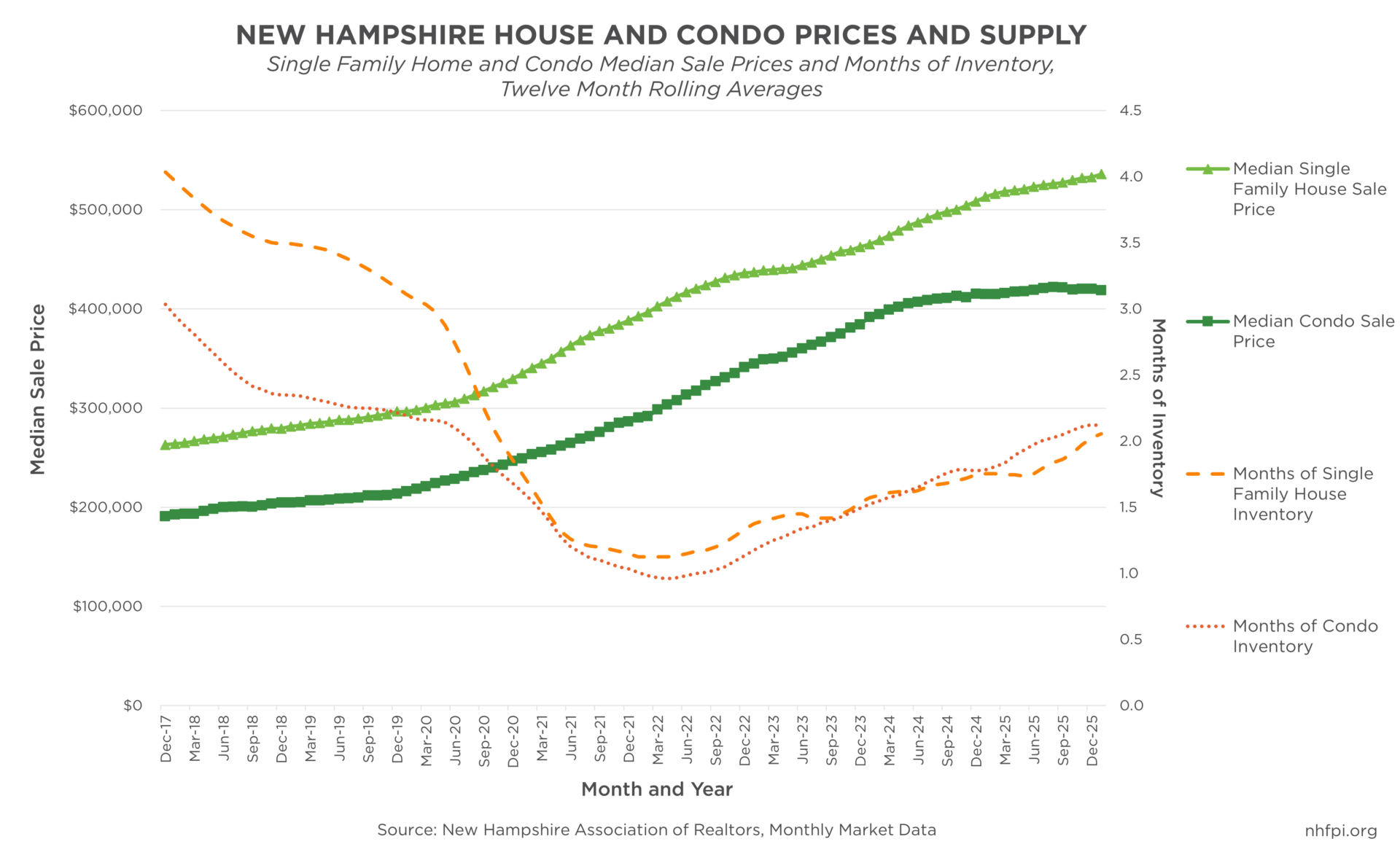 Inventory has increased modestly since pandemic lows, but New Hampshire’s housing supply remains well below balanced market levels. With an average of only 1.8 months of supply in 2025 and tens of thousands of units still needed, limited availability continues to push prices higher and restrict options for buyers and renters alike.