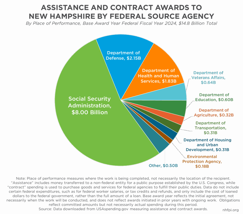 Federal funding plays a significant role in the New Hampshire economy. More than $14.8 billion were pledged to individuals or organizations in New Hampshire during FFY 2024, and that does not include the payments to the thousands of federal employees who work in the state, payments for health coverage for older adults through Medicare, or the assistance provided to households and businesses through the tax code. A more expansive measure, relying on older data, estimated that federal expenditures in New Hampshire, beyond solely assistance and contracts, totaled $21.8 billion in FFY 2022.